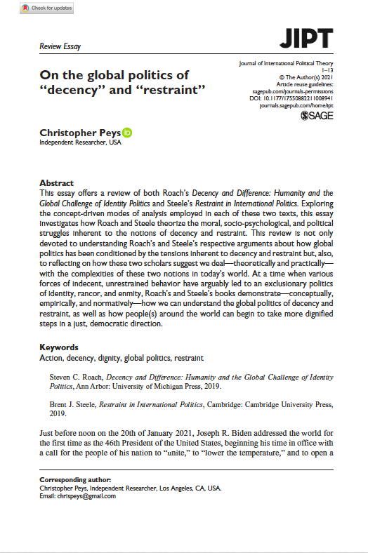 On the global politics of “decency” and “restraint,” Journal of International Political Theory 17(3): 553-565. https://doi.org/10.1177/17550882211008941