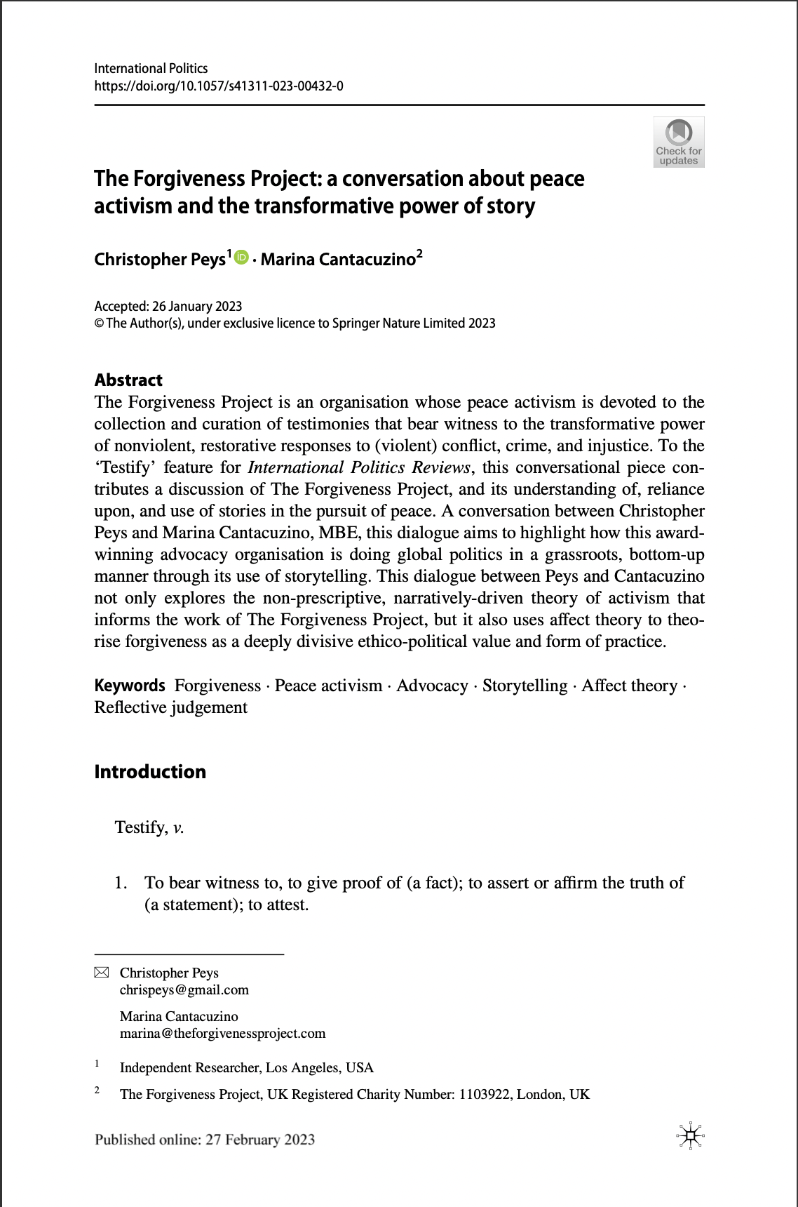 Christopher Peys and Marina Cantacuzino, “The Forgiveness Project: a conversation about peace activism and the transformative power of story,” International Politics 60, no. 2 (2023): 506-36. https://doi.org/10.1057/s41311-023-00432-0