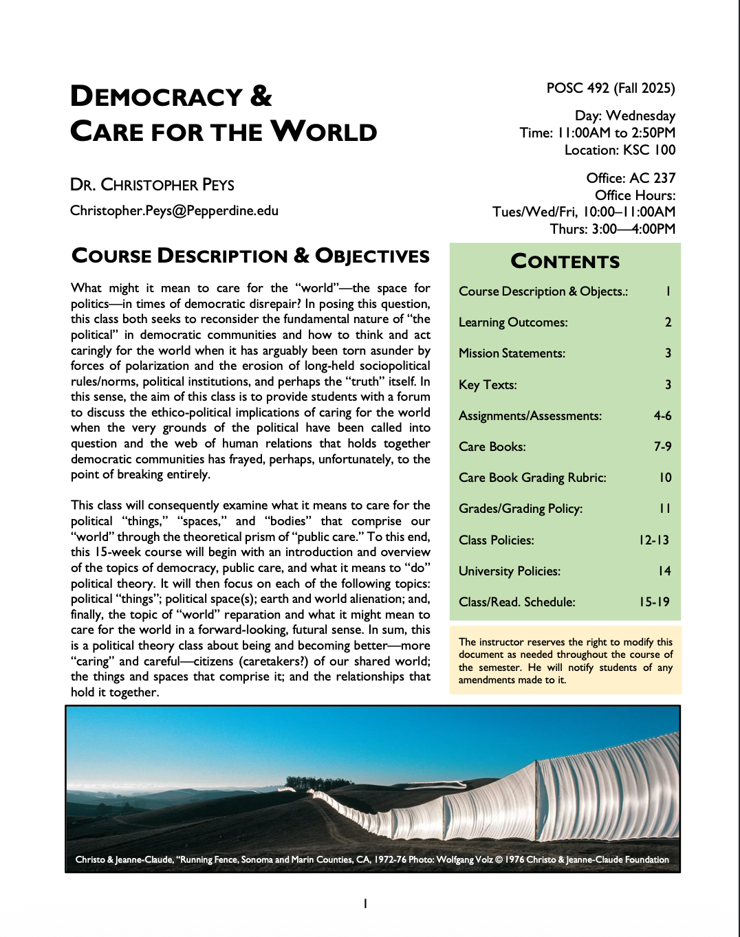This Political Theory class explores the topic of “public care” in five three-week sections. These sections examine what it might mean to care for the political “things,” “spaces,” and “bodies” that comprise our “world.” To this end, this course begins with an introduction and overview of the topics of democracy, public care, and what it means to “do” political theory. It then focuses on each of the following topics: political “things”; political space(s); earth and world alienation; and, finally, the topic of “world” reparation and what it might mean to care for the world in a forward-looking, futural sense. In sum, this is a political theory class about being and becoming better—more “caring” and careful—citizens (caretakers?) of our shared world; the things and spaces that comprise it; and the relationships that hold it together.